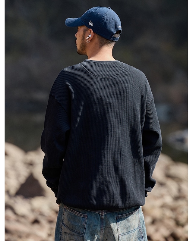 ワッフル生地の素材感で存在感が出せる長袖クルーネックTシャツ。シンプルながらも、着心地のよさとデザイン性を両立させた一着です。一枚で着ても、レイヤードスタイルにも活躍する汎用性の高さが魅力。カジュアルな装いを上品に格上げします。デイリーユースに最適なアイテムです。