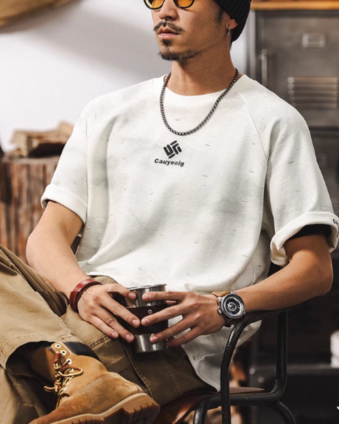 クルーネックのワンポイントロゴ入りショートスリーブTシャツ。