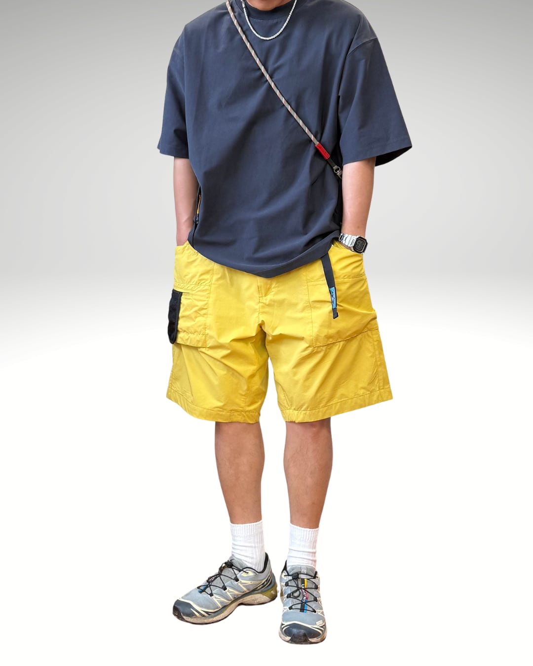コーディネートのポイントになるカラーが魅力のショートパンツです。カーゴポケットのメッシュパーツはポケットにインしてスッキリとさせることも可能です。軽くハリのあるので、シルエットが綺麗にでます。