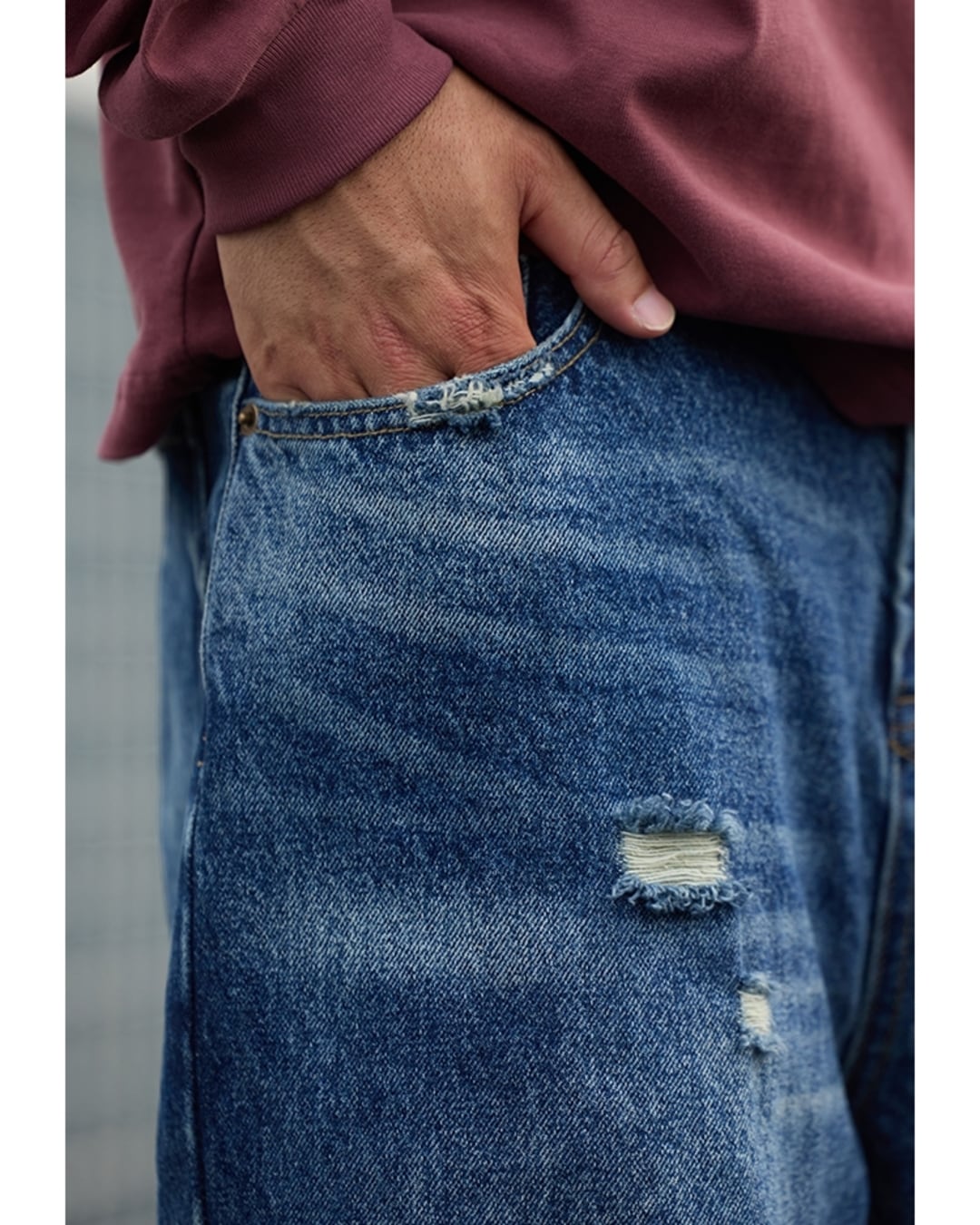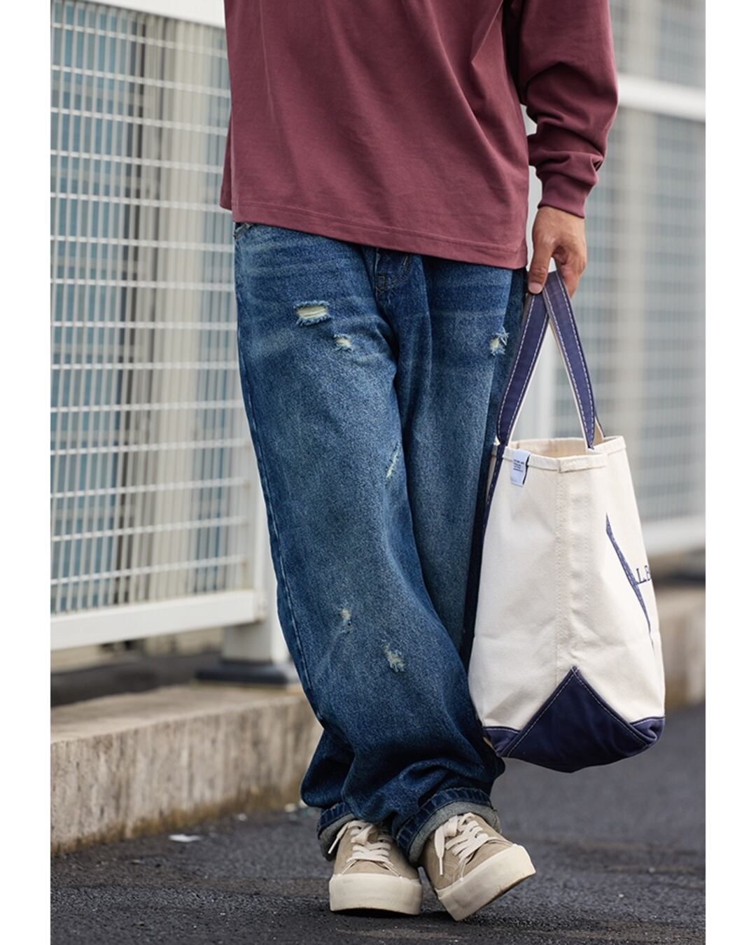 ワイドシルエットが魅力のダメージ加工デニムパンツ。