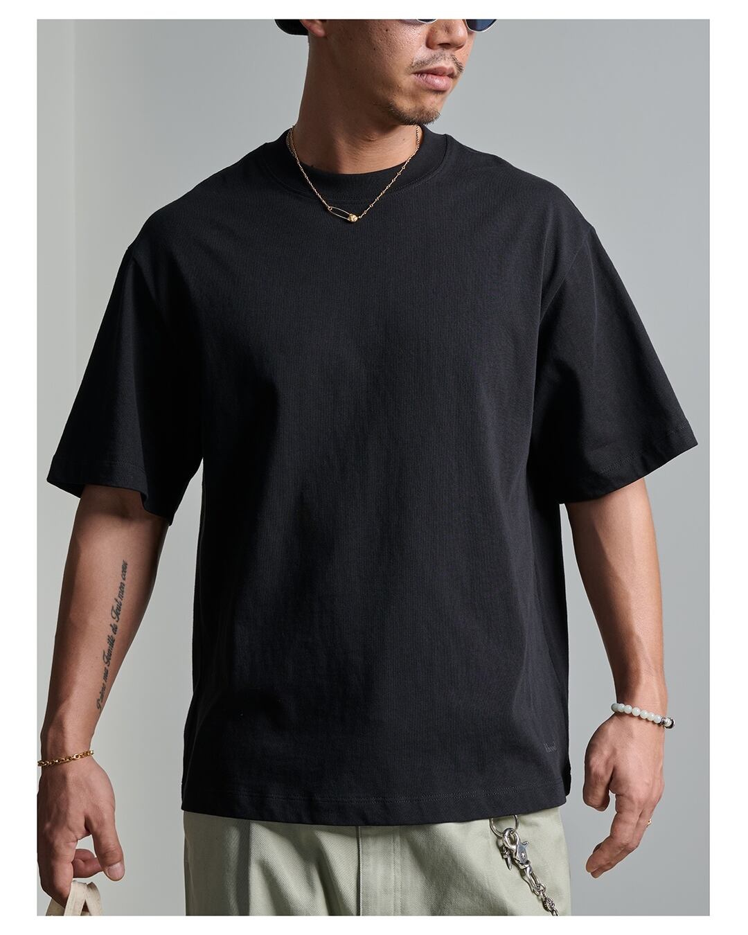 裾のワンポイント刺繍がさり気なくおしゃれなオーバーサイズクルーネック半袖Tシャツ。