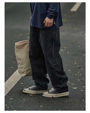 ゆったりとしたワイドレッグシルエットが魅力のデニムパンツ。