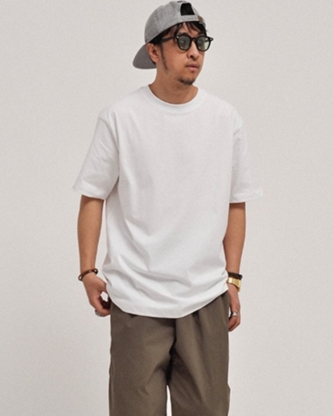 ボックスシルエットのオーバーサイズクルーネック半袖Tシャツ。