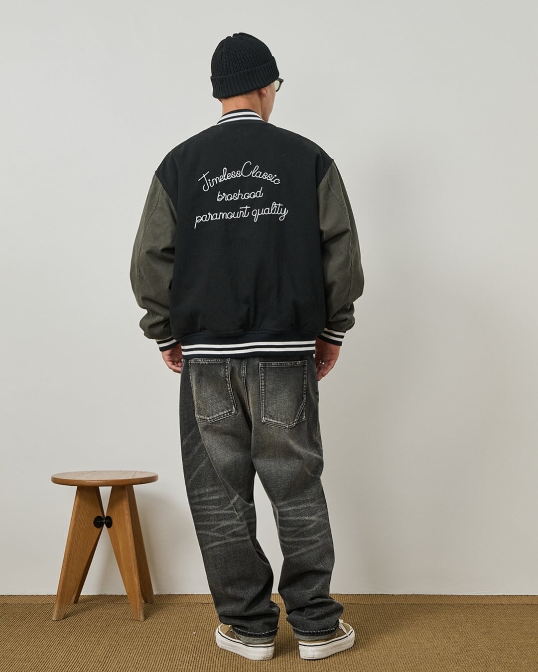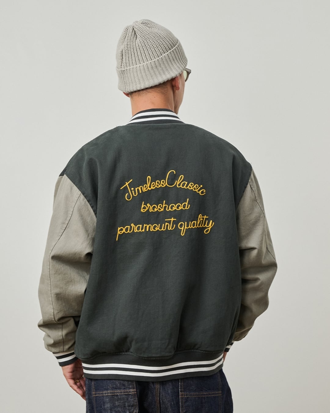 ヒップ丈の長さで、フロントボタンが特徴の長袖スタジアムジャケット。
