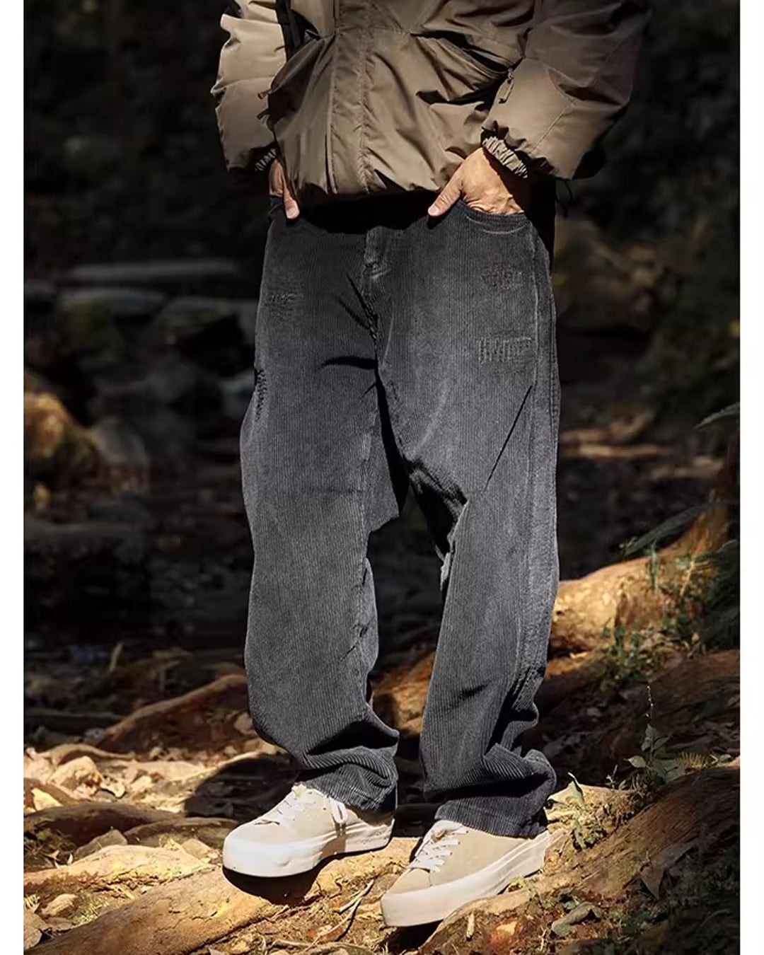 ワイドシルエットでラフな着こなしを演出するコーデュロイパンツ。素材感が、秋冬のコーディネートに温かみを加えます。