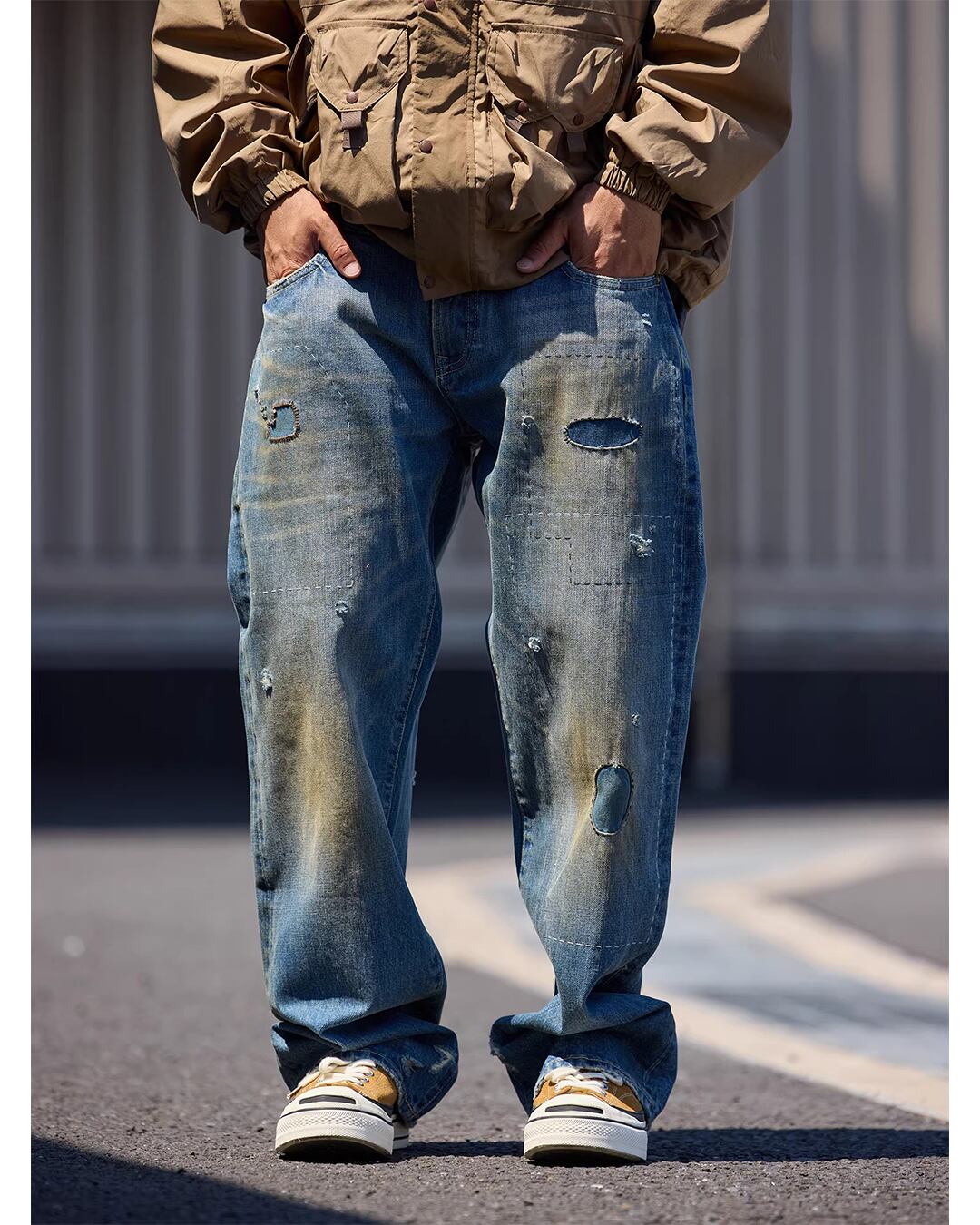 ヴィンテージ感あふれる、ワイドストレートデニム。長年穿き込んだような色落ちとダメージ加工が、こなれた雰囲気を演出します。ゆったりとしたシルエットで、リラックスしたカジュアルスタイルに最適。Tシャツやスニーカーと合わせて、ラフに着こなすのもおすすめです。