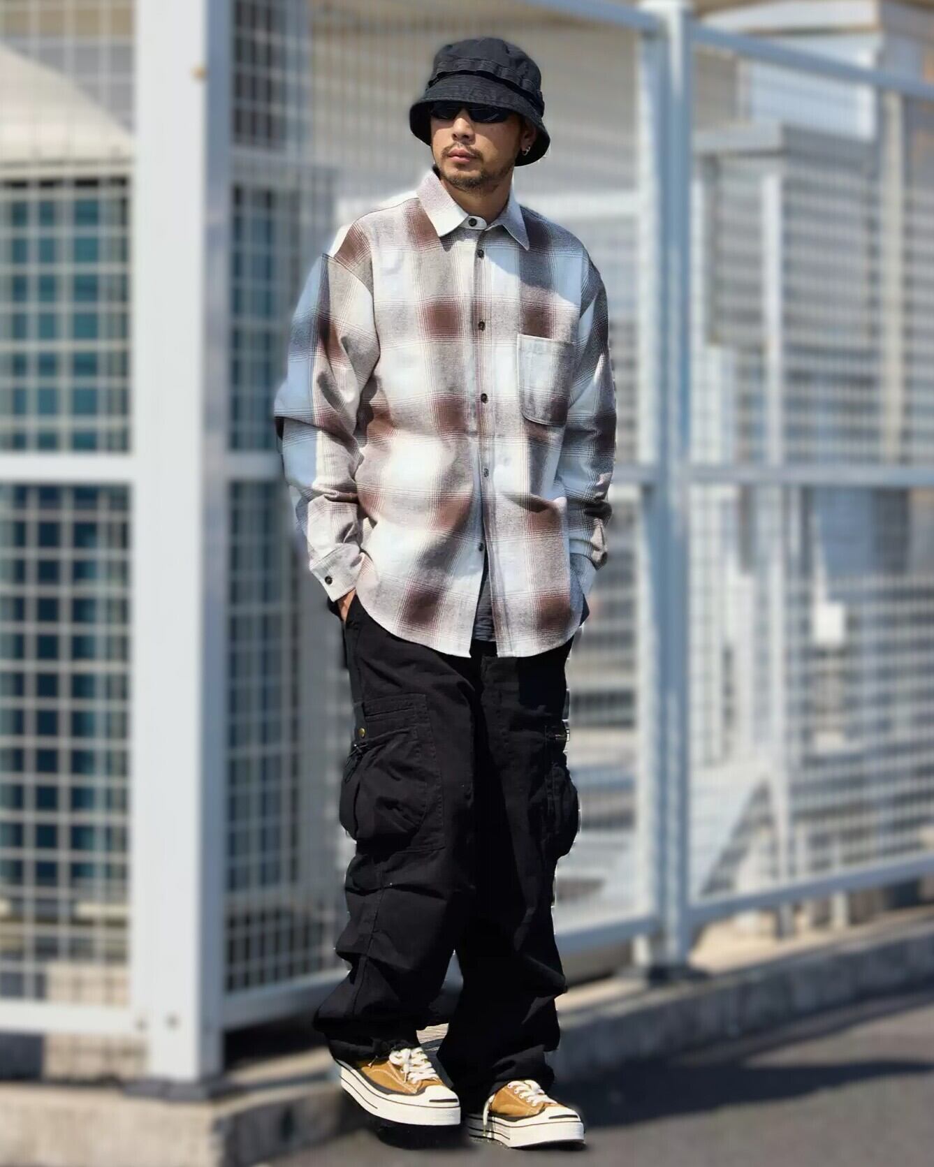 カジュアルな着こなしに最適な長袖チェック柄シャツ。胸元のパッチポケットがアクセント。一枚での着用はもちろん、羽織りとしても活躍する汎用性の高いアイテムです。ゆったりとしたシルエットで、リラックスした着心地を提供します。