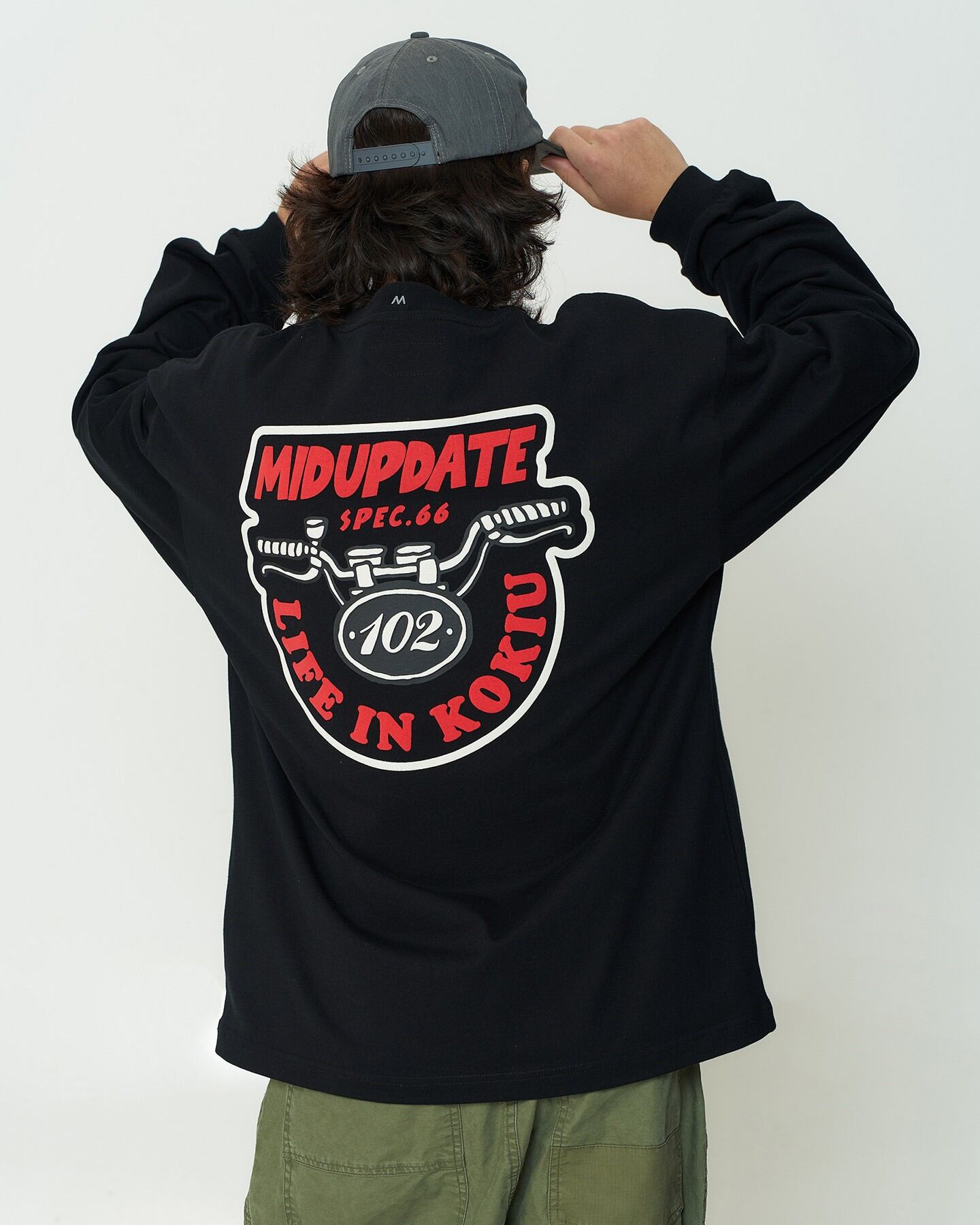 バックプリントが目を引く長袖Tシャツ。