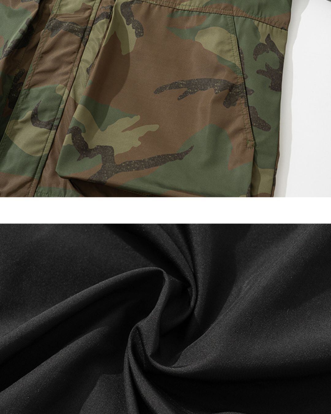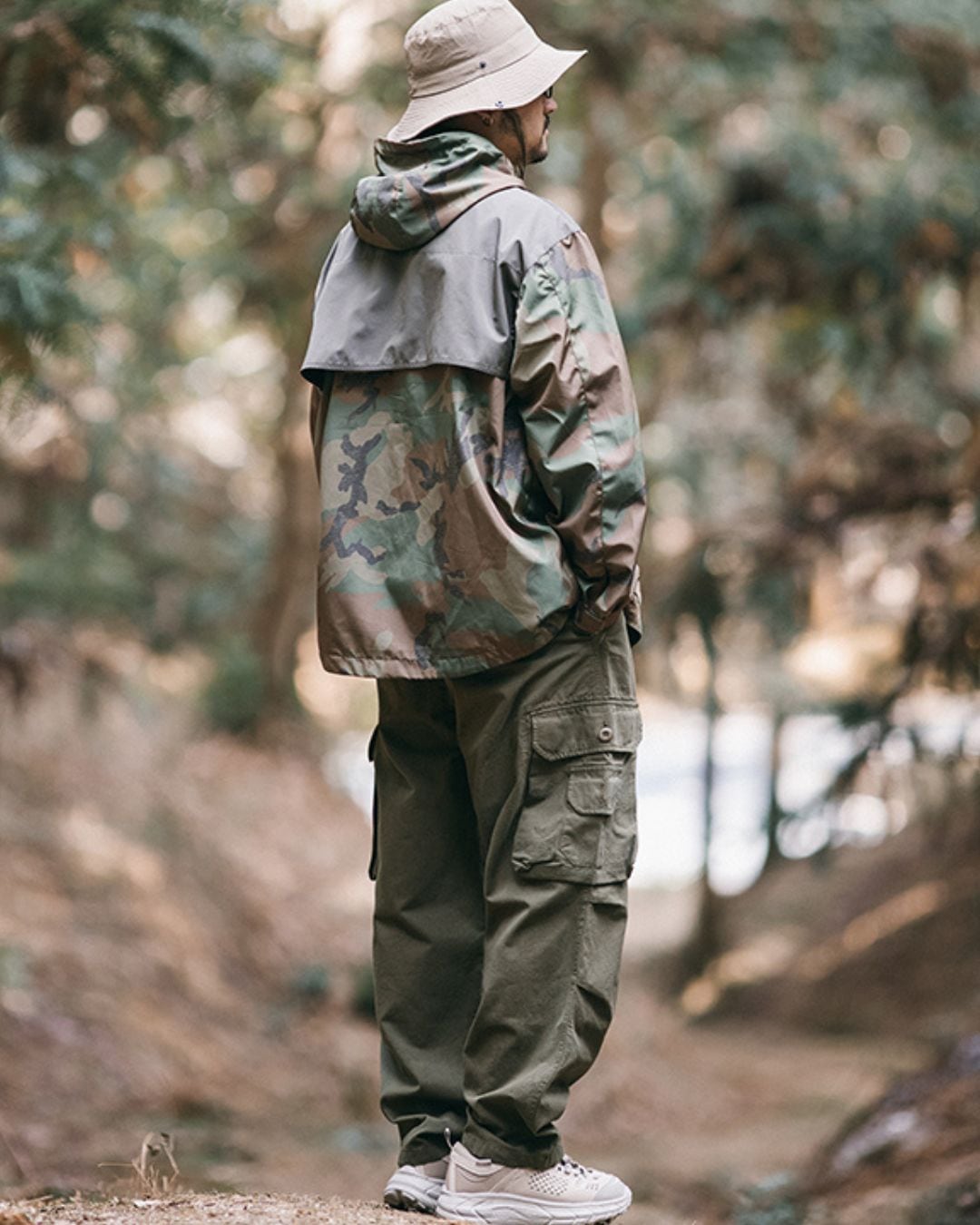 都会的なカモフラージュ柄が魅力のフーデッドジャケット。フロントボタンと、程よくゆとりのあるシルエットが特徴です。カジュアルなスタイルに合わせやすく、デイリーユースに最適な一着です。様々なシーンで活躍すること間違いなし。